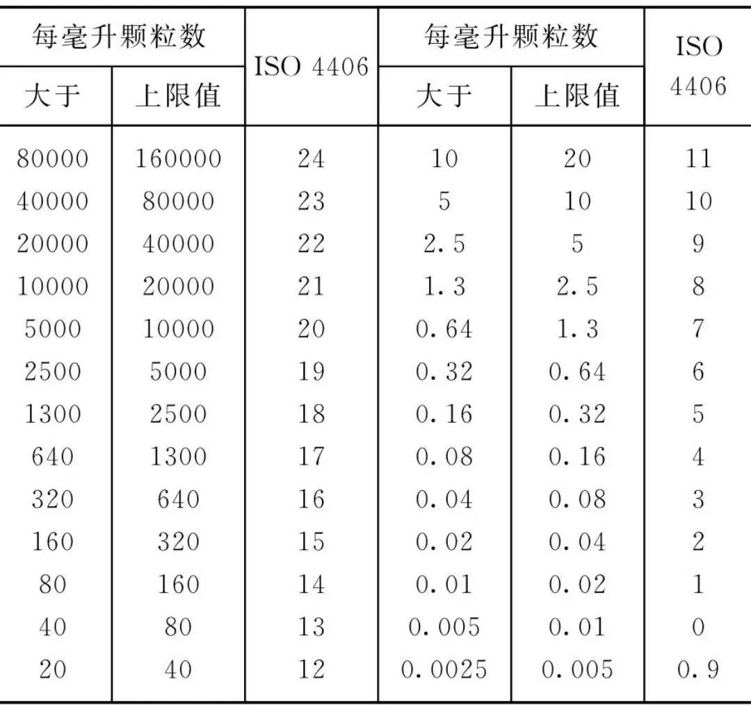 ②ISO 4406固體顆粒污染度國際標準 ISO 4406油液污染度國際標準采用兩個數(shù)碼表示油液的污染度等級,前面的數(shù)碼代表1mL油液中尺寸大于5μm的顆粒數(shù)的等級,后面的數(shù)碼代表1mL油液中尺寸大于15μm的顆粒數(shù)的等級,兩個數(shù)碼之間用一斜線分隔。
