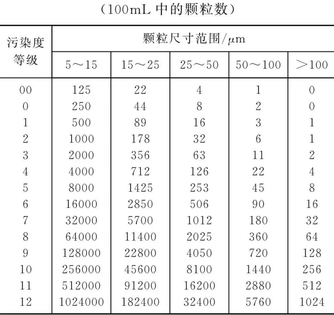 例如污染度等級18/13表示油液中大于5μm的顆粒數(shù)等級為18,每毫升顆粒數(shù)為1300~2500;大于15μm的顆粒數(shù)等級為13,每毫升顆粒數(shù)為40~80。