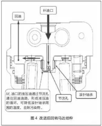 我們?cè)?a href="http://m.xingqiming.cn/index.html" target="_blank">回轉(zhuǎn)馬達(dá)滾針軸承上新增加補(bǔ)油口,并通過(guò)單向閥與液壓油箱連接,單向閥開(kāi)啟壓力即為補(bǔ)油口背壓,一般為0.5MPa。補(bǔ)油口是為回轉(zhuǎn)馬達(dá)停止時(shí)釋放壓力與消除氣穴設(shè)置的油口,可為回轉(zhuǎn)馬達(dá)補(bǔ)充液壓油及釋放壓力。為了改進(jìn)滾針軸承潤(rùn)滑不良的狀況,我們?cè)诨剞D(zhuǎn)馬達(dá)殼體上增加了節(jié)流孔,形成補(bǔ)油口-節(jié)流孔-回油口的油道。改進(jìn)后回轉(zhuǎn)馬達(dá)結(jié)構(gòu)如圖4所示。