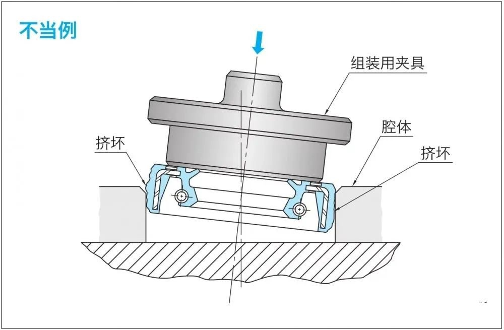 2. 安裝時(shí),請(qǐng)將油封水平放置在腔體孔上均勻的加壓。避免油封在傾斜狀態(tài)下被強(qiáng)制壓入,導(dǎo)致油封的配合部件損壞或卡住,引起油封泄漏,如下圖所示。
