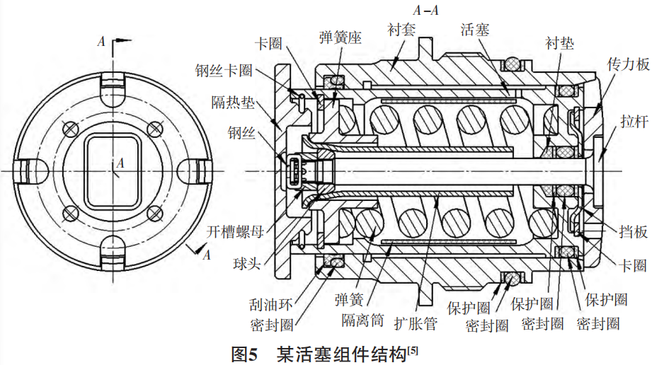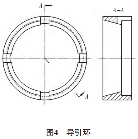 用于密封圈理順的挑針、套于螺紋上防止螺紋劃傷 密封圈的導(dǎo)套和保護(hù)圈校正的校正棒、收壓板、收壓套等 都屬密封件安裝的常用工裝,除此之外,一些設(shè)計上因結(jié) 構(gòu)受限而無法處理的槽或孔必須借助工裝來進(jìn)行彌補, 否則密封圈的損傷無法消解。圖4所示為圖5某活塞組件結(jié)構(gòu)的輔助工裝實例,從中可以看出,如果不使用導(dǎo)引環(huán) 對襯套右端為了傳力板角向定位而銑掉的部分進(jìn)行補 形,在活塞壓入襯套時,必然會成為活塞上的密封圈在該 位置鼓出的誘因,所以該活塞組件的傳力板、拉桿應(yīng)選在活塞壓入襯套之后安裝。同理,對閥套上不能開環(huán)形凹槽 過渡處理的交叉孔,也可以使用工藝柱銷進(jìn)行補形。