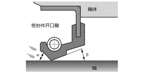 那為什么兩個(gè)方向會(huì)有區(qū)別呢?這其實(shí)主要來源于油封的設(shè)計(jì)原理。大家可以參考下圖。在主要起作用的密封唇口區(qū)域,左右兩側(cè)的角度大小是不一樣的。目前常見骨架油封的設(shè)計(jì)是密封件開口側(cè)(也稱彈簧側(cè)、流體側(cè)fluid side)的角度α比另外一側(cè)(也稱空氣側(cè)air side)的角度β大。為了和其它文獻(xiàn)統(tǒng)一,下面我們統(tǒng)一稱為流體側(cè)和空氣側(cè),不過大家知道代表的是哪一側(cè)就可以了。