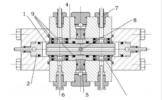 -活塞桿 2-行程加載活塞 3-襯套 4-偏載襯套 5-偏載活塞 6-溫度測量評價系統(tǒng) 7-泄漏量評價系統(tǒng) 8-注油孔 9-測試試樣
