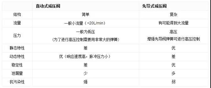 減壓閥也分直動式和先導式兩種,直動式減壓閥在系統(tǒng)中較少單獨使用,先導式減壓閥則應用較多,直動式減壓閥與先導式減壓閥特點的比較可以參考下表: