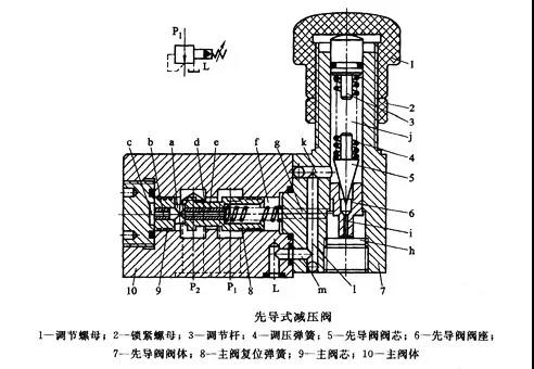 下圖為先導式減壓閥的結(jié)構。它由先導閥和主閥兩部分組成。先導閥閥芯5在調(diào)壓彈簧4的作用下,緊壓在先導閥閥座6上,調(diào)節(jié)螺母1可改變彈簧4對先導閥作用的預緊其作用是克服摩擦力、將主閥芯壓向最左端。減壓閥的作用有兩個: