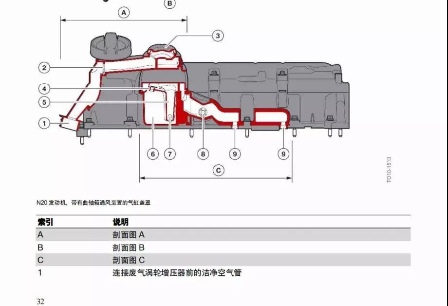 這是N20發(fā)動(dòng)機(jī)的曲軸箱強(qiáng)制通風(fēng)系統(tǒng)的工作路徑和原理。