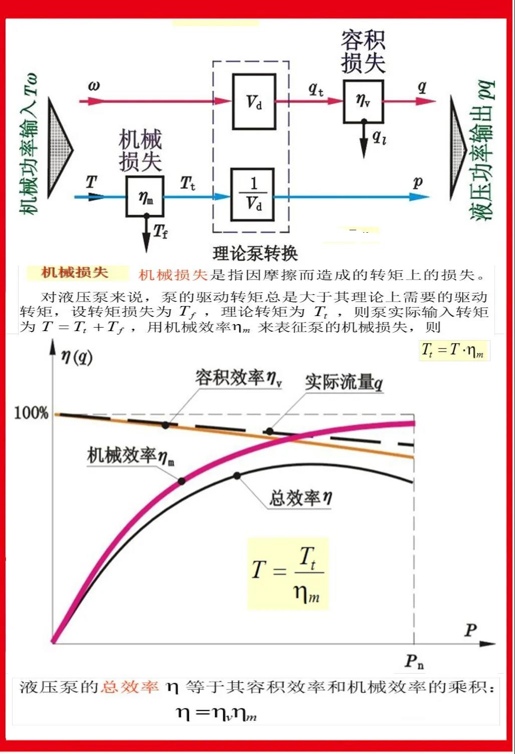 液壓泵、馬達(dá)的能量傳遞關(guān)系見(jiàn)下圖。容積效率和機(jī)械效率在總體上與油液的泄漏和摩擦副的摩擦損失有關(guān)。