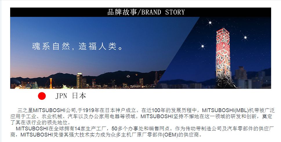 1919年,在日本神戶,三之星作為工業(yè)皮帶的專業(yè)制造商正式成立。百年的風雨兼程,雖歷盡滄桑,但仍充滿朝氣;百年的斗轉(zhuǎn)星移,雖千變?nèi)f化,但仍初心不改。 百年前的破殼 讓三之星從無到有 百年間的創(chuàng)造 讓三之星如日中天 沾百年之福,成無憂生產(chǎn) 在100年的發(fā)展歷程中,MITSUBOSHI堅持不懈地在這一領(lǐng)域的研發(fā)和創(chuàng)新,奠定了其在該行業(yè)的領(lǐng)先地位。為適應未來世界的需求,更加積極向更高技術(shù)挑戰(zhàn),為滿足人們的生活、豐富社會提供新產(chǎn)品。 三星皮帶為滿足各種苛刻的汽車開動條件而設(shè)計開發(fā)的高品質(zhì)傳動帶,具有壽命長,無需維修的特點。利用新生產(chǎn)工藝,在一定程度上能夠很好的減少噪音,增強耐磨性,提高耐久性。并能減輕車輛承受的負荷,以此達到省油的效果。 三之星皮帶產(chǎn)品多樣,可用范圍廣,產(chǎn)品包含:一般產(chǎn)業(yè)用機帶、辦公家用電器用機帶、農(nóng)業(yè)機械用機帶、汽車用機帶,廣泛應用于工業(yè)、農(nóng)業(yè)機械、汽車以及辦公家用電器等領(lǐng)域,質(zhì)量有保證,使用更安心,讓用戶無后顧之憂。
